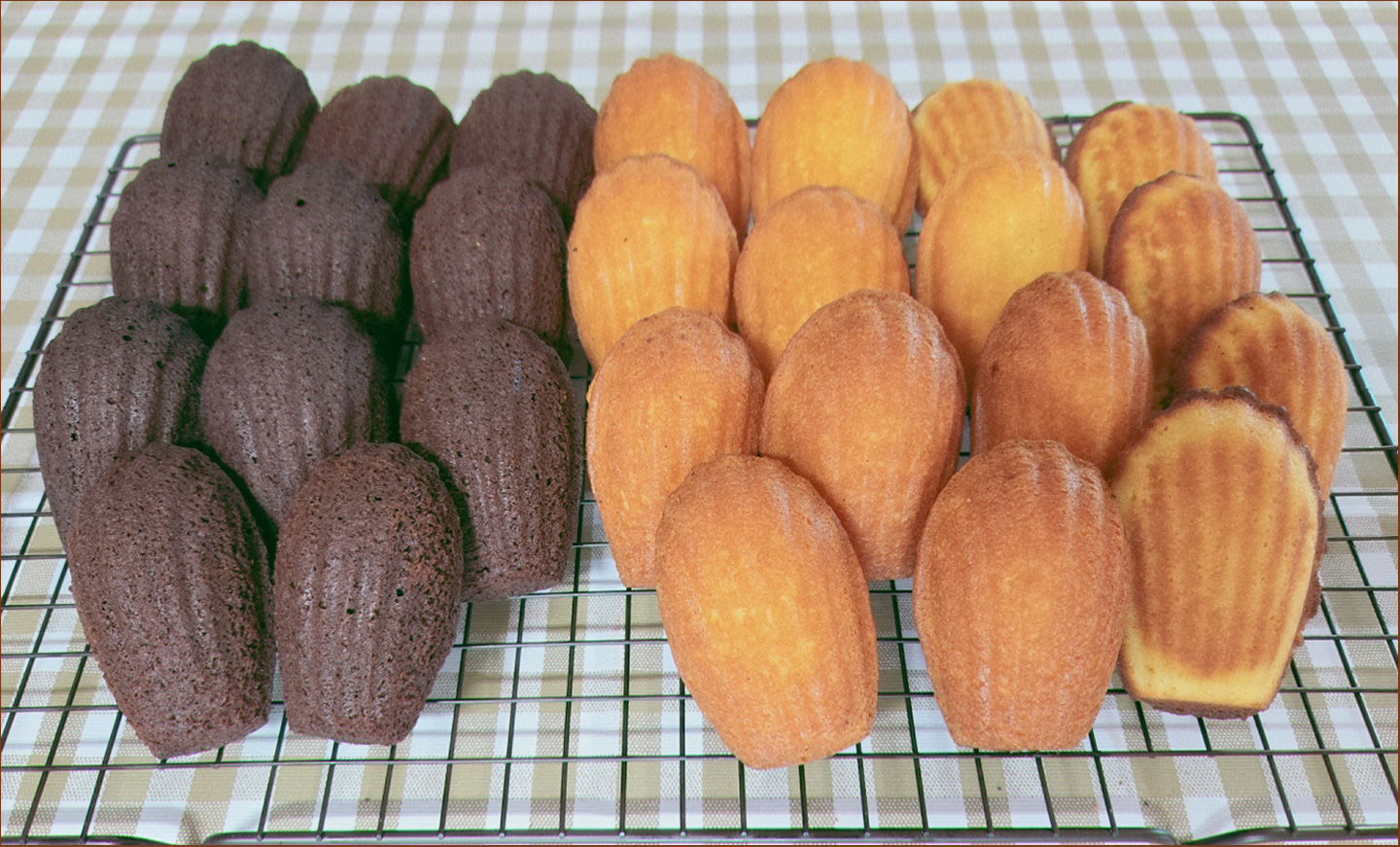 10. 저는 160도에서 9분 굽고, 마들렌 팬을 반대방향으로 돌려준 뒤 철판을 한장 받쳐서 3분 더 구웠습니다. - 반죽 색상이 너무 어두워서 색깔을 보고 판단하기가 조금 어려울 수 있어요, 돌려줄 때 꼬지로 중앙을 꽂아보고 반죽이 묻어나는지 확인하시는 방법도 있습니다.
