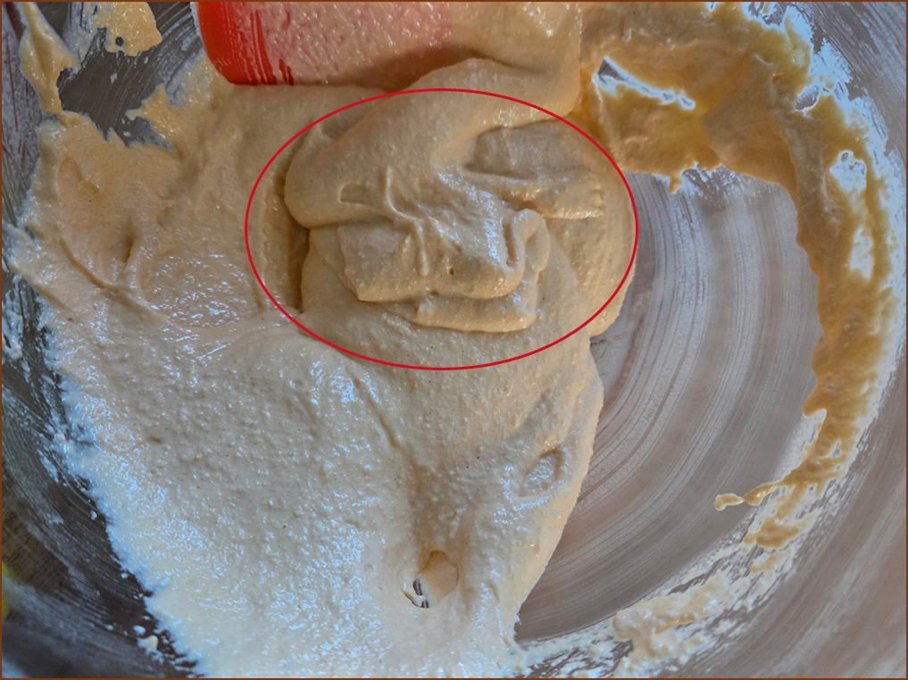 6-1. 다 섞은 반죽을 떠서 떨어뜨려봅니다. 이때 덩어리 째로 뚝 끊기면서 떨어질 경우 6-2번을 진행합니다.