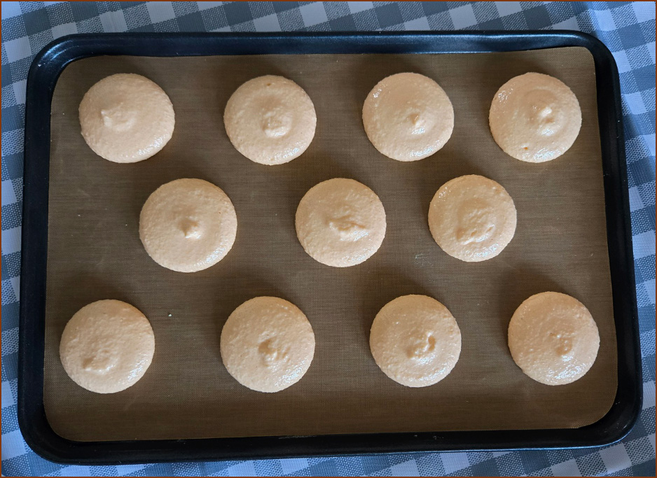 8. 철판에 실리콘페이퍼를 깔고 반죽을 짤주머니에 담아 높이 1cm, 지름 4cm의 일정한 사이즈로 팬닝합니다.