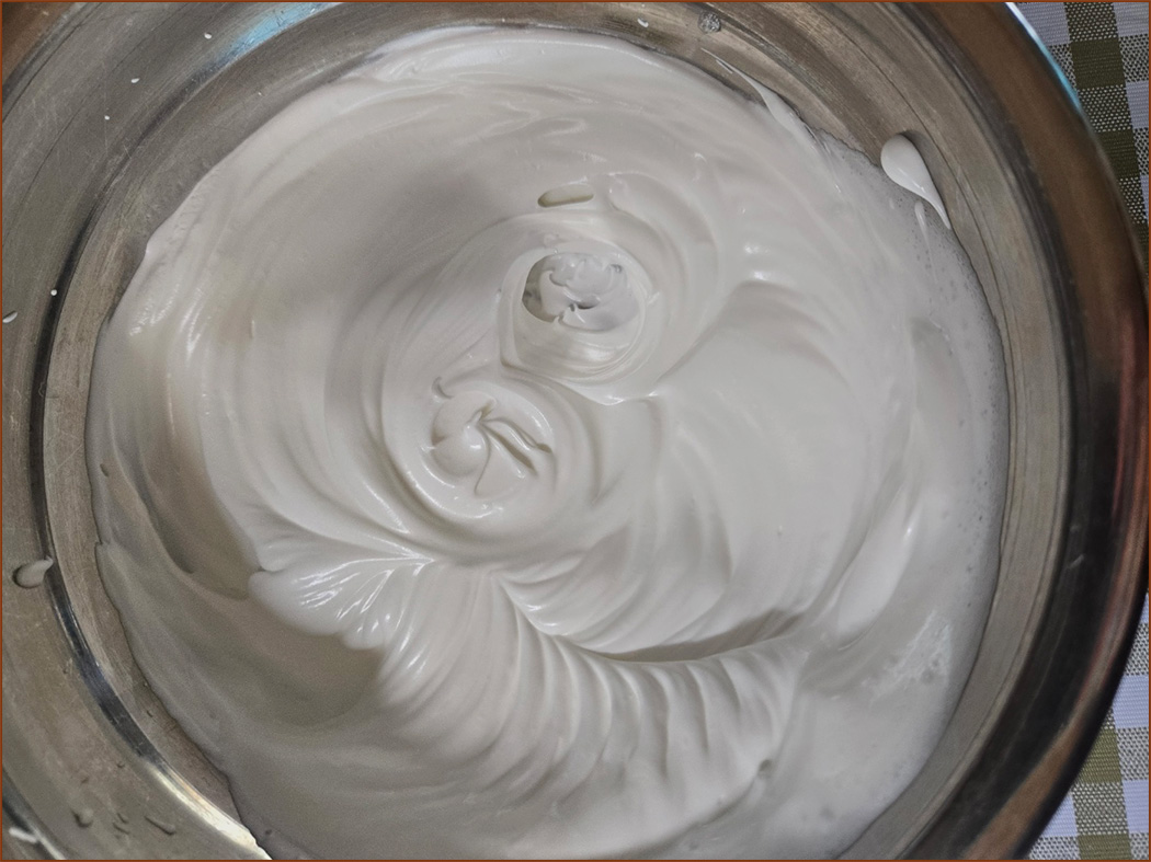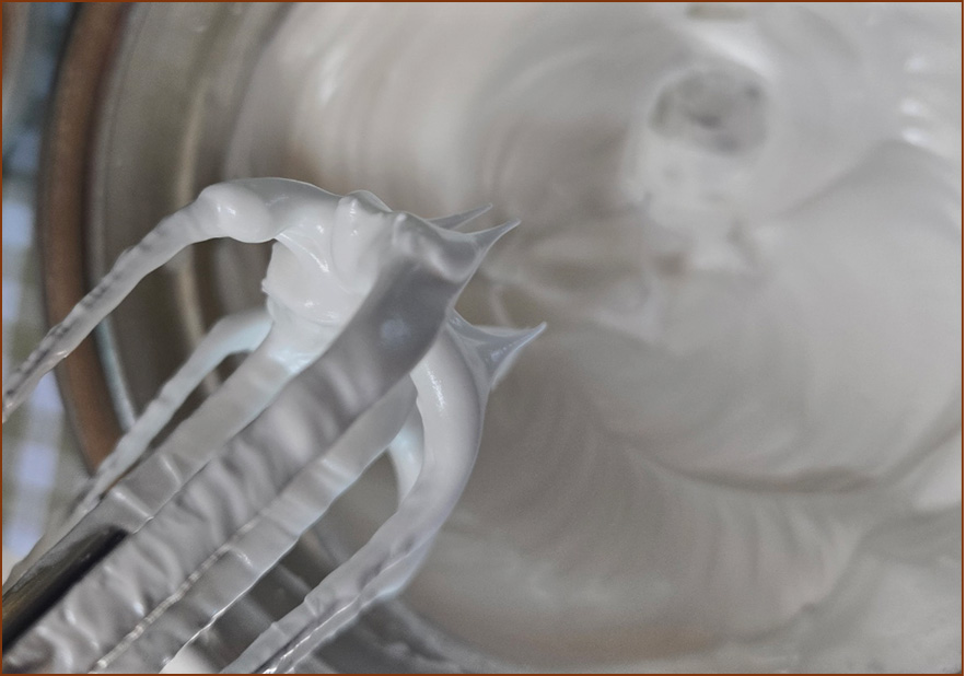 - 설탕이 다 섞이면, 고속으로 휘핑합니다. >> 머랭을 떴을 때 갈고리가 아닌 짧으면서 뾰족한 모양될 때까지 고속으로 휘핑해주세요.
