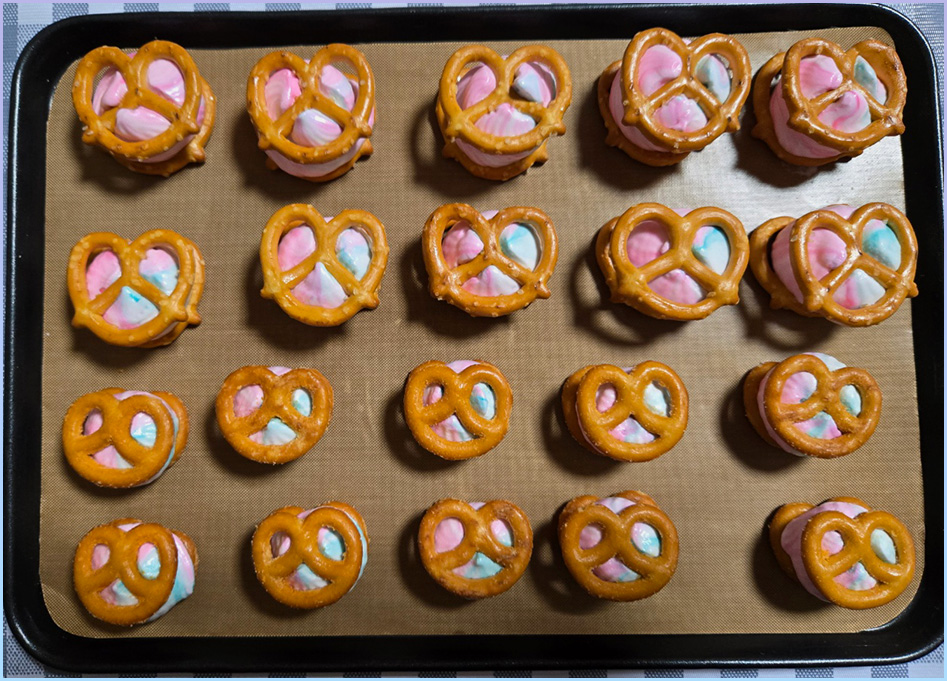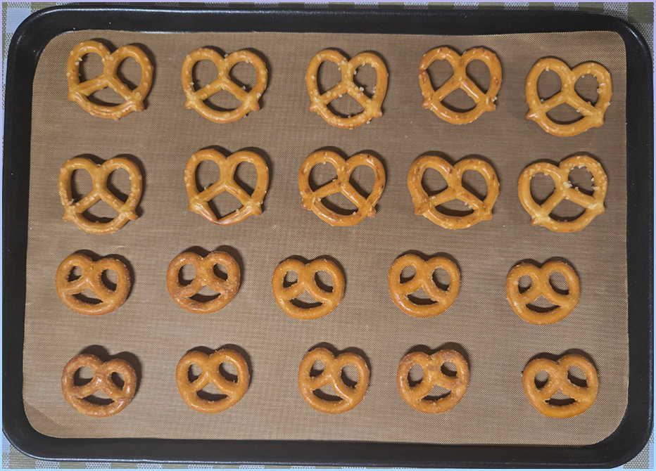 3. 프레첼머랭쿠키를 만드는 경우 팬에 미리 미니프레첼을 일정한 간격으로 올려주세요.