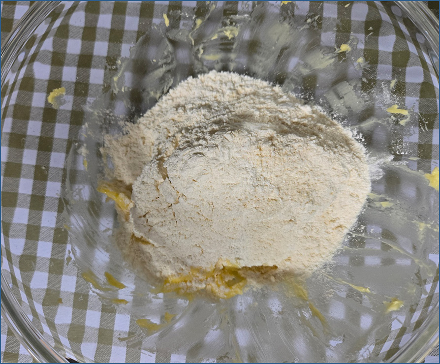 3. 계란이 섞이면 체에 내린 가루재료를 넣고 주걱을 수직으로 세워 반가르듯이 섞는 동작을 반복합니다.