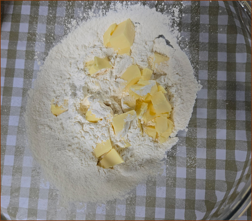 3. 체에 내린 박력분에 깍둑썰기 된 얼린 버터를 넣고 스크래퍼로 다져줍니다.