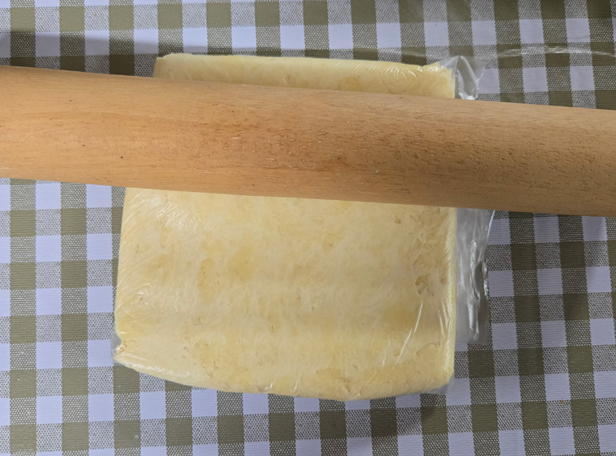 5. 반죽을 비닐에 넣고 비닐을 네모모양으로 접어서 밀대로 반죽을 평평하게 살살 밀어줍니다.