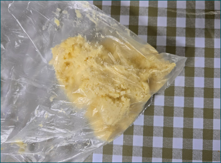 - 저는 실온버터로 진행해서 볼에서 주걱으로 잘라 섞었지만, 이렇게 하면 잘게 다져지지가 않습니다.
