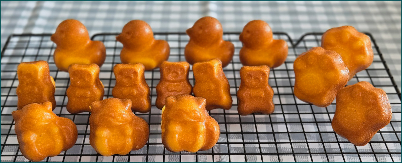마들렌의 배꼽이 전부 잘 올라와서 캐릭터들을 세워놓을 수 있네요 ㅎㅎ 🤣 너무 귀여운 마들렌들 ㅎㅎ 반죽 팬닝량만 잘 맞춰주시면 정말 어렵지 않을거에요! 모두 즐거운 베이킹하셔요 🥰